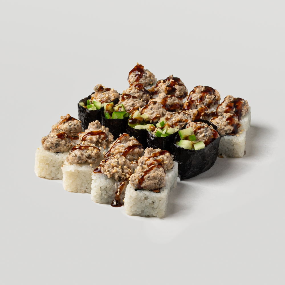 Ролл Татами ( рис, нори, лосось терияки, сливочный сыр, огурцы, угорь, копченое куриное филе, майонез, соус унаши.)