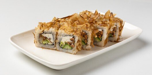 Рис, нори, снежный краб, майонез, огурец, лук жареный, соус спайси.