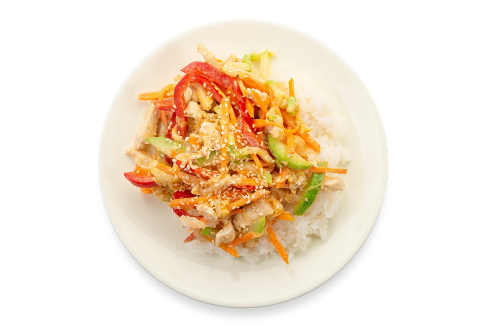 Рис на пару, Овощи, Куриное филе, Соус, Кунжут.