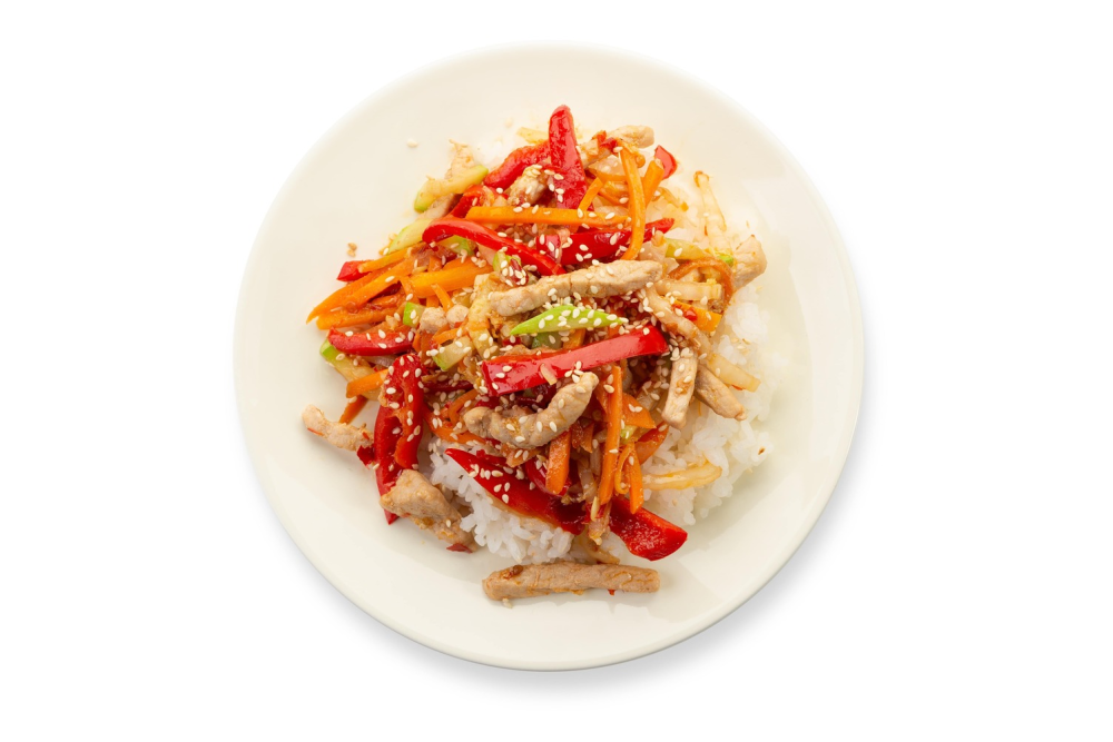Рис на пару, Овощи, Свинина, Соус, Кунжут.