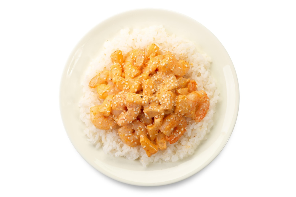 Креветки, Соус карри, Ананас, Рис на пару, Сливки, Кунжут.